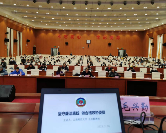 2023年2月26日,云南尚矩律师事务所毛兴勤律师受邀为西山区政协委员授课,毛兴勤律师以“坚守廉洁底线 做合格政协委员”为题,从政协委员的廉洁素养、政协委员常见的廉洁问题、提升政协委员廉洁履职能力的途径等三个方面为200余名政协委员全面介绍了政协委员廉洁履职的相关知识。毛兴勤教授的讲解结合实际、深入浅出、易于理解,为政协委员上了一堂生动的廉政教育课。