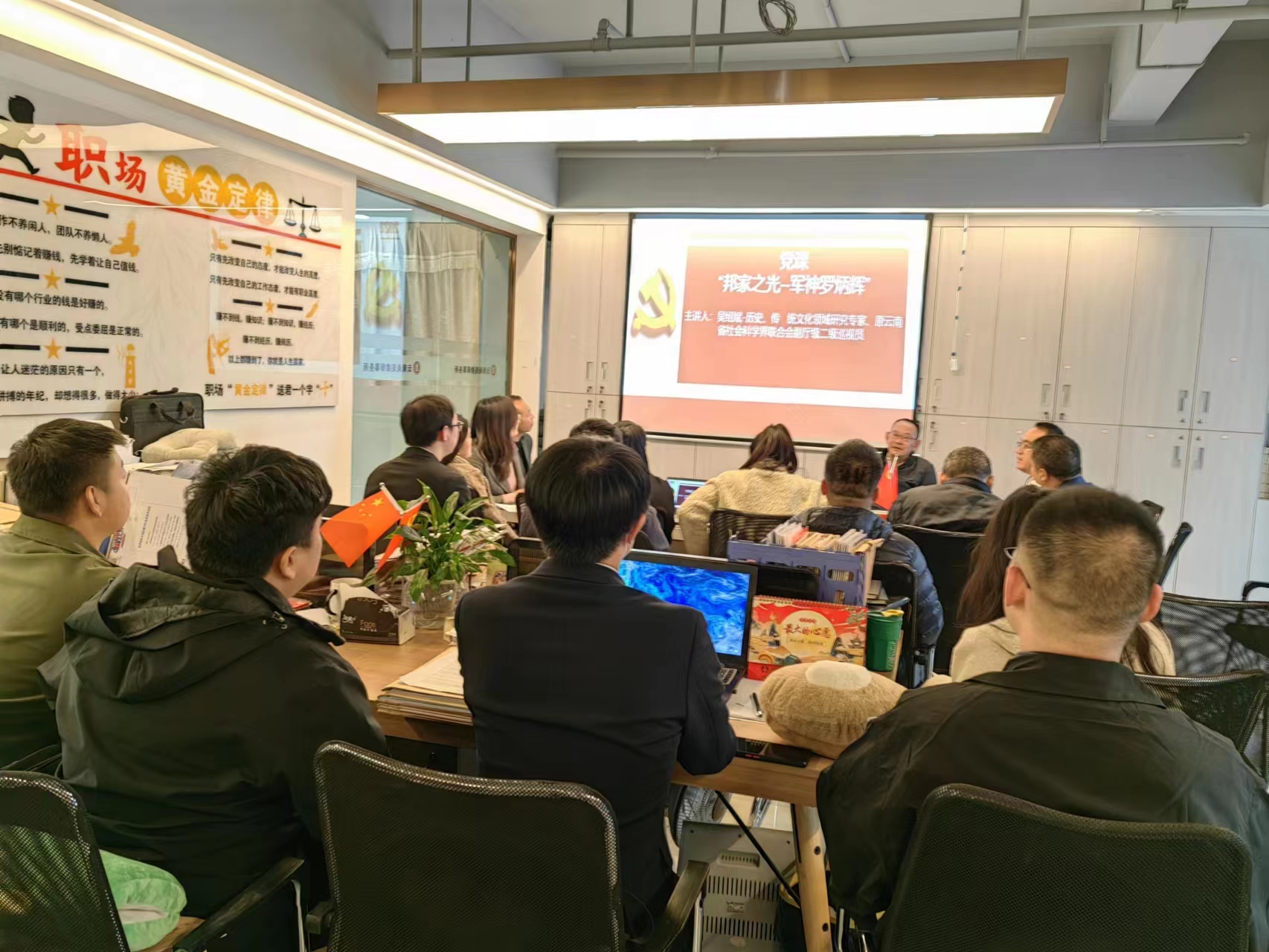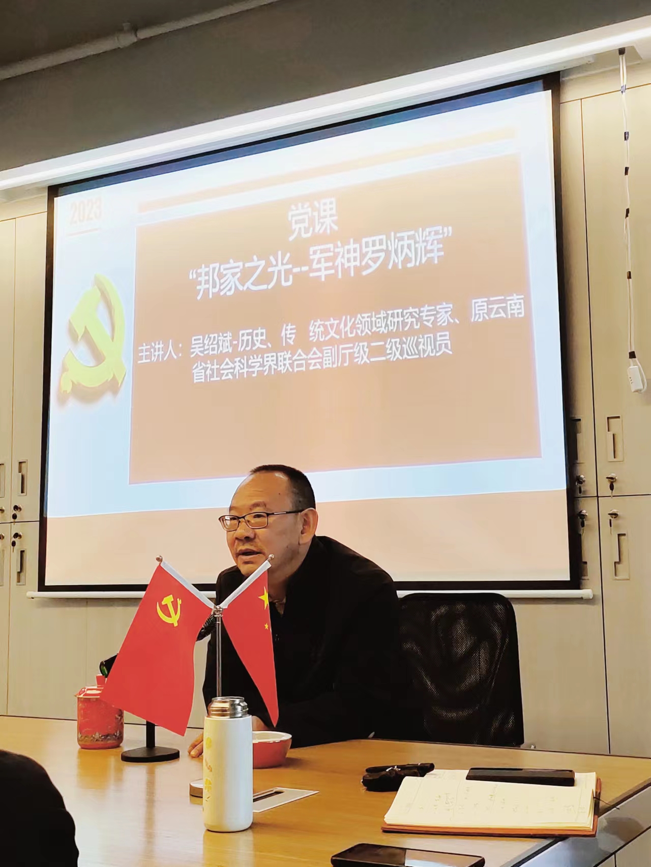为深化学习的党的二十大精神,加强政治建设,巩固党史学习,进一步丰富党员教育形式,增强党员教育实践,2023年2月24日下午,我所特邀历史、传统文化领域研究专家,原云南省社会科学界联合会副厅级巡视员吴绍斌同志为我所全体成员讲授了一堂别开生面的故事党课—《邦家之光-军神罗炳辉》。