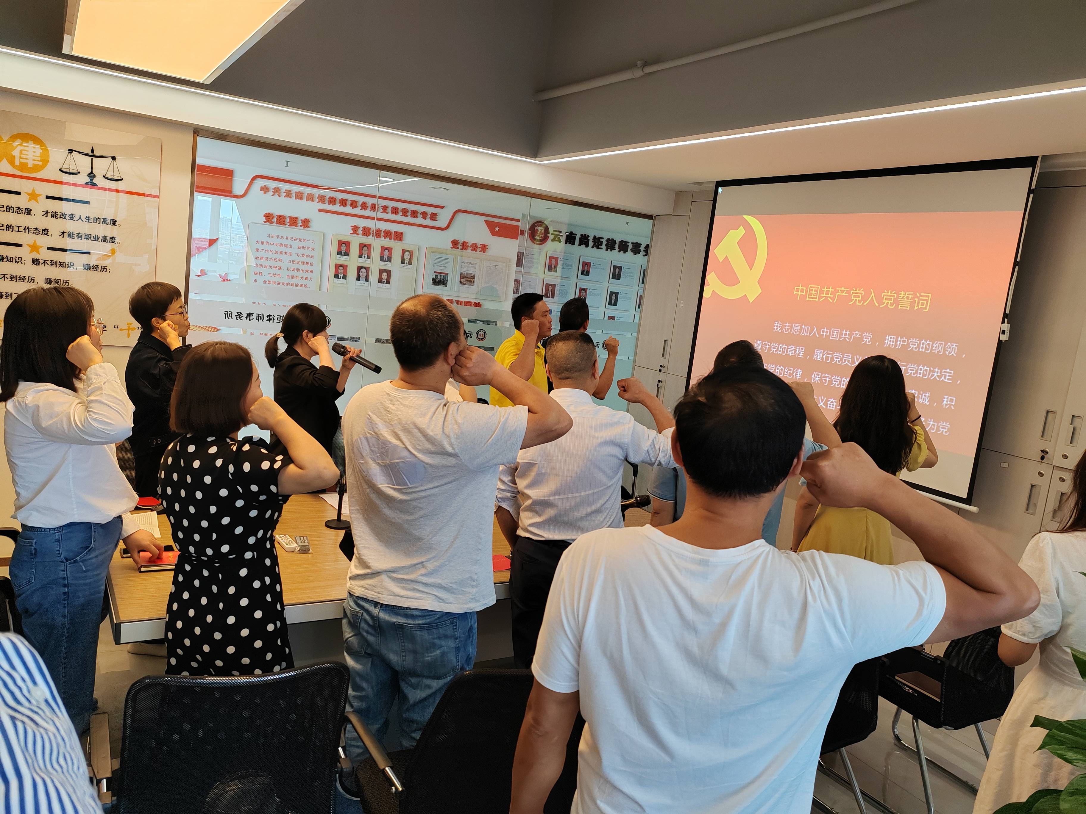 按照议程安排,首先,云南尚矩律师事务所党支部书记刘先龙同志要求全体党员“戴党徽、亮身份、扛责任、做表率”,而后带领全体成员举起右手,大声宣读重温入党誓词。此次重温入党誓词活动是此次共驻共建的重要内容,不仅重温了党员们的入党初心,还进一步唤醒了党员们内心深处的党章意识和党纪观念,增强了党员们的使命感、责任感和荣誉感,是发扬党的优良传统、建设高素质党员队伍采取的重要举措之一。