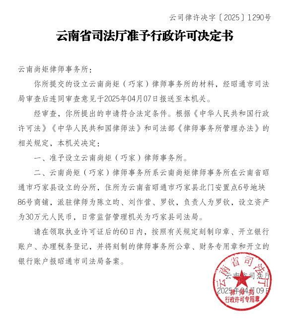 2025年4月17日,经云南省司法厅审批,准予云南尚矩(巧家)律师事务所设立,罗钦律师为分所负责人。云南尚矩律师事务所在昭通巧家开设的云南尚矩(巧家)律师事务所正式成立。此次新分所的设立,是云南尚矩律师事务所布局全省法律服务市场、深入基层服务群众的重要举措。