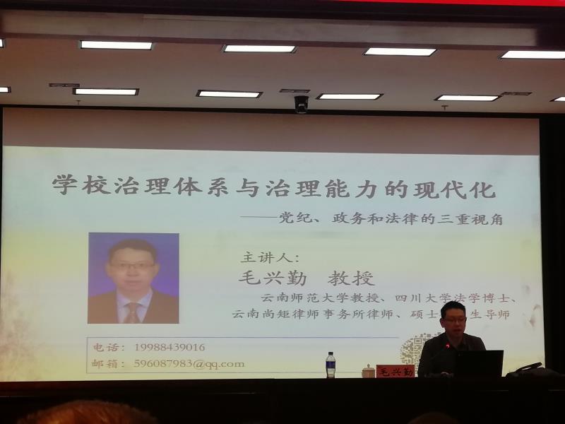 10月22日,受云南省委宣传部邀请,我所毛兴勤律师以“学校治理体系和治理能力的现代化:从党纪、政务、法律的三重视角”为题,为全省马克思主义学院负责人授课。毛兴勤律师从国家治理体系和治理能力现代化的基本内涵、学校治理体系和治理能力现代化过程中应注意的问题、学校治理中常见的党纪政务及法律风险等方面进行了详细讲解。